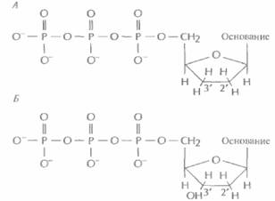 | Рис, 5.11. А. Дидезоксинуклеотид (отсутствуют 2'- и 3'-гидроксильные группы в кольце). Б. Дезоксинуклеотид (отсутствует только 2'-гидроксильная группа). |