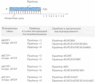 Первый шаг стандартной процедуры дидезоксисеквенирования состоит в гибридизации синтетического олигонуклеотида длиной 17—20 звеньев со специфическим участком одной из цепей клонирующего вектора, соседствующим со вставкой. Этот олигонуклеотид является праймером, поставляющим 3'-гидроксильную группу для инициации синтеза. Раствор с праймером распределяют по четырем пробиркам, в каждой из которых находятся четыре дезоксинуклеотида, dATP, dCTP, dGTP и dTTP (один из них — изотопно меченный), и один из четырех дидезоксинуклеотидов (ddATP, ddCTP, ddGTP или ddTTP). Концентрацию каждого дидезоксинуклеотида подбирают таким образом, чтобы он оказался включенным по всем позициям в смеси растущих цепей, а не только в первой встретившейся ему позиции. (Напомним, что после присоединения дидезоксинуклеотида рост цепи сразу останавливается,