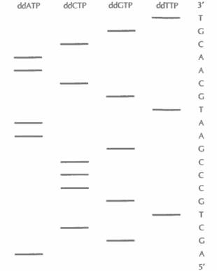 | Рис. 5.15. Схематическое изображение радиоавтографа, получающегося при секвенировании ДНК с помощью дидезокси-метода. В каждую из лунок вносили содержимое одной из четырех пробирок, в которых находился один из дидезоксинуклеотидов: ddATP, ddCTP, ddGTP или ddTTP. Нуклеотидная последовательность считывается с радиоавтографа снизу вверх. На рисунке она приведена справа. |