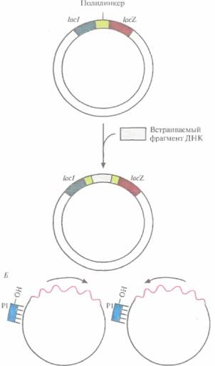 | Рис. 5.16. Использование бактериофага М13 для клонирования и секвенирования. А. Встраивание фрагмента ДН К в двухцепочечную репликативную форму ДНК М13. Б. Секвенирование комплементарных цепей клонированного фрагмента ДНК с помошью одного и того же лраймера (Р1). Стрелками показана ориентация вставки в векторе. |