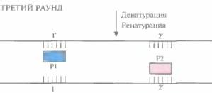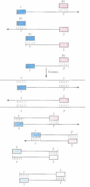 | Рис. 5.18. Первый раунд ПЦР. ДНК-мишень фланкирована последовательностями 1'—2 в одной цепи и последовательностями 1—2' — в другой. К образцу ДНК добавляют праймеры (Р1 и Р2), ДНК-полимеразу Tag и четыре дезоксирибонуклеозидтри фосфата (dNTP). Смесь нагревают до 95 °С, инкубируют в течение 1 мин и медленно охлаждают до 55 °С. При этой температуре праймеры, добавленные в избытке, спариваются с разделенными цепями. Повышают температуру до 75 °С. В этих условиях происходит синтез обеих цепей ДНК, начинающийся с 3'-гидроксильных концов праймеров. Каждая из синтезированных цепей имеет гораздо большую длину, чем расстояние от 3'-гидроксильной группы «ее» праймера до концевого нуклеотида последовательности, комплементарной второму праймеру. Эти цепи служат матрицами во втором раунде ПЦР. |