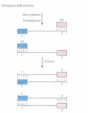 | Рис. 5.21. Тридцатый раунд ПЦР. На этом этапе в реакционной смеси содержатся практически одни «короткие матрицы». |