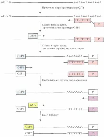 вии dATP. Этот фермент случайным образом присоединяет дезосирибонуклеотиды к 3'-концу цепи. Поскольку в данном случае в реакционной смеси присутствует только dATP, на этом конце появляется цепочка адениновых остатков — ро1у(А)-хвост. С ним спаривается праймер P-oligo(dT). инициирующий синтез второй цепи. Проводят ограниченное число раундов ПЦР с указанными праймерами, а затем добавляют вторые праймеры и амплифицируют кДНК, отвечающую 5'-концу мРНК.