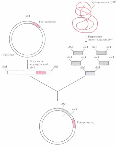 | Рис. 6.1. Идентификация сильных регулируемых промоторов. В плазмиду встраивают ген-репортер без промотора. Хромосомную ДНК. разрезают рестрицируюшей эндонуклеазой AbcIи встраивают фрагменты в плазмиду. Если ген-репортер эффективно экспрессируется, значит, клонированный фрагмент содержит функциональный промотор. |