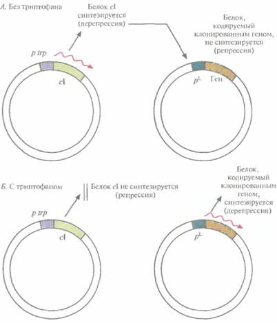 ем химического индуктора. Однако в опытных установках (20—100 л) и в промышленных биореакторах (>200 л) температуру нельзя изменить мгновенно, для этого требуется время от 30 до 60 мин; кроме того, на подъем температуры нужна энергия. И время, и энергия стоят дорого. Столь же дорого обходится и применение химического индуктора, например ИПТГ. Все это может сделать процесс неэкономичным. Для преодоления некоторых проблем, связанных с использованием pL-промотора для крупномасштабного производства белковых продуктов, была разработана двухплазмидная система. Ген репрессора cI поместили под контроль trр-про-мотора и включили в малокопийную плазмиду (рис. 6.4), что обеспечило невысокий уровень синтеза репрессора. Вторая плазмида содержала клонированный ген, находящийся под контролем pL-промотора. Как видно из рис. 6.4, А, в отсутствие триптофана включается trр-промотор и синтезируется репрессор cI, выключающий pL-промотор. И наоборот, как видно из рис. 6.4, Б, при наличии триптофана trp-промотор выключается, репрессор не синтезируется, а pL-промотор активно работает.