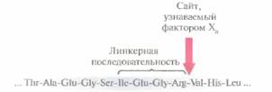 В зависимости от предназначения белкового продукта клонированного гена он может использоваться как таковой или в составе химерного белка, причем последний вариант встречается нечасто. Например, из-за присутствия фрагмента хозяйского белка большинство химерных белков оказываются непригодными для применения в клинике, а сам продукт клонированного гена-мишени может оказаться неактивным. Кроме того, для химерных белков предусмотрена более сложная процедура тестирования, которую они должны пройти, чтобы получить разрешение к применению у соответствующих организаций. Все это заставляет искать способы удаления лишних аминокислотных последовательностей из молекулы получаемого продукта. Один из таких способов основан на присоединении белка, кодируемого геном-мишенью, к белку клетки-хозяина, содержащему короткий пептид, распознаваемый специфической протеазой небактериального происхождения. Такое присоединение тоже программируется на уровне ДНК. Олигонуклеотидные линкеры, несущие сайты для протеаз. можно пришить к клонированному гену до того, как такая конструкция будет введена в экспрессирующую векторную систему слияния. Линкером может служить, например, олигонуклеотид, кодирующий пептид Ile-Glu-Gly-Arg. После синтеза и очистки химерного белка для отделения белкового продукта, кодируемого клонированным геном, можно использовать фактор свертывания крови Ха, который является специфической протеиназой, разрывающей пептидные связи исключительно на С-конце последовательности Ile-Glu-Gly-Arg (рис. 6,6). Более того, поскольку такой пептид