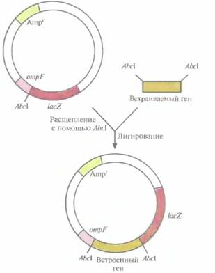 | Рис. 6.7. Клонирующий вектор системы слияния. Он содержит ген устойчивости к ампициллину (Атрг) в качестве селективного маркера, 5 '-концевой сегмент гена ompF, колирующий N-конец наружного мембранного белка, сайт для рестрицирующей эндонуклеазы AbcIи укороченный ген ß-галактозидазы (lacZ). Ген, который хотят клонировать, встраивают в АbcI-сайт. После транскрипции и трансляции этой генетической конструкции образуется трехкомпонентный химерный белок. |