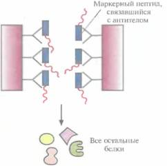 Рис. 6.8. Очистка химерного белка с помощью иммуноаффинной хроматографии. Антитела к маркерному пептиду химерного белка фиксируют на твердом носителе и пропускают через колонку химерный белок. Маркерный пептид, входящий в состав химерного белка, связывается с антителами, а все остальные белки свободно проходят через колонку. Очищенный химерный белок элюируют из колонки.