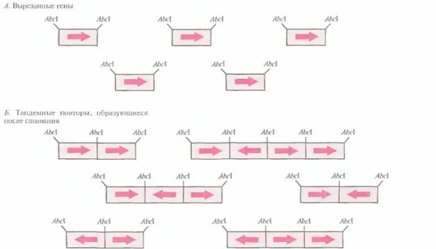 | Рис. 6.11. Образование случайно ориентированных тандемных повторов. А. Клонированные гены вырезают из клонирующего вектора с помощью рестрицируюшей эндонуклеазы АbсIи отделяют от векторной ДНК. Б. Создают условия, при которых происходит сшивание вырезанных генов. Поскольку нуклеотидные последовательности обоих выступающих концов генов одинаковы, последние могут соединяться в любой ориентации. В результате образуются тандемные повторы из случайно ориентированных последовательностей. |