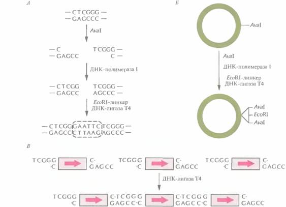 | Рис. 6.12. Клонирование нескольких копий гена в одной плазмиде. А. Создание вектора. Плазмиду разрезают по AvaI-сайту и образовавшиеся липкие концы достраивают с помощью ДНК-полимеразы I E. coli. К тупым концам присоединяют EcoRI-линкер, замыкающий кольцо. Б. Встраивание EcoRI -линкера в AvaΙ-сайт в плазмиде. B. Образование однонаправленного тандемного повтора. |