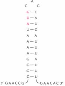 | Рис. 6.13. Внутрицепочечное спаривание в молекуле мРНК, препятствующее эффективной трансляции. GGGGG — сайт связывания рибосомы, AUG (красные буквы) - инициаторный кодон, CAG-CAU-GAU-UUA-UUU — несколько первых кодонов. Обратите внимание, что кроме обычных для мРНК пар A-U и G-C иногда образуются пары G-U. |
