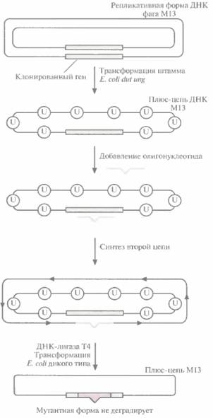 встраиванию в ДНК при репликации нескольких остатков dUTP вместо dTTP. Второй фермент – это дефектная урацил-К-гликозилаза (ung). В отсутствие функциональной урацил-М-гликозилазы остатки dUТР, случайно встроившиеся в ДНК, не могут быть удалены. В одноцепочечной ДНК M13, синтезированной в таких клетках Е. соli, примерно 1% тимидиновых остатков оказываются замененными уридиновыми. Олигонуклеотид с некомплементарным основанием отжигают с урацилсодержащей ДНК М13 и in vitro достраивают вторую