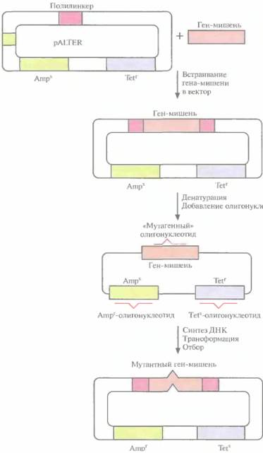 ДНК — матрицей. Одноцепочечные разрывы в новосинтезированной цепи зашиваются с помощью ДНК-лигазы Т4. По окончании синтеза и лигирования продуктами реакции трансформируют клетки E. coli. Трансформантов отбирают по признаку устойчивости к ампициллину и чувствительности к тетрациклину. Примерно 90% из них содержат специфическую мутацию в клонированном гене. У остальных трансформантов клонированный ген не был изменен либо потому, что олигонуклеотид не гибридизовался с ним, либо потому, что он вытеснялся в ходе синтеза ДНК. Клетки, несущие мутантный клонированный ген, идентифицируют с помощью гибридизации. Все плазмиды, штаммы, ферменты, олигонуклеотиды (кроме того, который предназначен для изменения клонированного гена), а также буферы продаются в наборе, что облегчает работу.