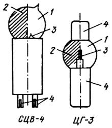 Фотоелементи з зовнішнім фотоефектом(рис. 6) складаються із скляного балона, з якого викачано повітря. Катодом в ньому є частина внутрішньої поверхні балона 2, вкрита світлочутливим шаром (здебільшого з окислів лужних металів Cs, Rb, K, Na); катод освітлюється через прозору частину балона 1. Анодом є напівсферична металева ложечка 3, розміщена в центрі балона. Катод і анод з'єднані з двома штирками-контактами 4, за допомогою яких фотоелемент включається в електричне коло. Щоб збільшити фотострум внаслідок іонізації газу, фотоелементи наповнюють інертним газом. На рис. 6наведено зразки сучасних фотоелементів та маркування їх: СЦВ-4 (сурм'яноцезієвий, вакуумний) і ЦГ-3 (цезієвий газонаповнений). При робочій напрузі 240 В чутливість вакуумного фотоелемента становить 8*10-5 А/лм.