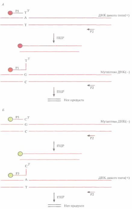 Располагая двумя парами зондов, можно установить генетический статус любого человека. Например, ДНК гетерозиготных носителей дает положительный ответ с обеими парами зондов, ДНК лиц, обладающих двумя копиями нормального гена, — только с тем набором зондов, который содержит нуклеотид, комплементарный нормальному сайту, и, наконец, ДНК индивидов с двумя измененными копиями гена — только с набором зондов, детектирующим мутантный сайт. Чтобы минимизировать необходимое для анализа количество исходной ДНК, перед гибридизацией участок ДНК-мишени, содержащий тестируемый сайт, амплифицируют с помощью ПЦР,