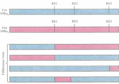 | Рис. 10.1. Структура генов ИФa2, ИФa3 и четырех гибридных генов. Сравнение нуклеотидных последовательностей генов ИФa2 и ИФa3 обнаруживает наличие у них одинаковых сайтов для рестрицирующих эндонуклеаз (RE1, RE2, RE3). Рестрикция по этим сайтам и лигирование полученных фрагментов приводят к образованию различных гибридных генов. В нижней части рисунка представлены четыре из них. |