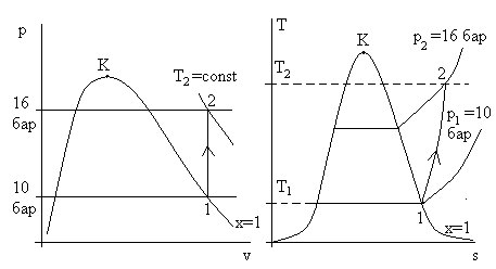 Определяем состояние воды после нагрева. При р2 = 16 бар по той же таблице имеем v΄΄ = 0,1238 м3/кг. Но при v = const v2 = 0,195 м3/кг. Следовательно, v΄΄ < v2, и делаем вывод: в конце процесса нагрева вода находится в состоянии перегретого пара.