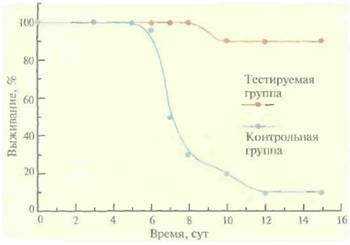 | Рис. 11.5. Выживание мышей, иммунизированных вирусной ДНК, Тестируемых мышей иммунизировали Е. соli-плазмидой, несушей кДНК нуклеопротеина вируса гриппа А под контролем промотора вируса саркомы Рауса. Контрольным мышам вводили только плазмидную ДНК, По оси абсцисс отложено время, прошедшее после контакта животных с вирусом гриппа. |