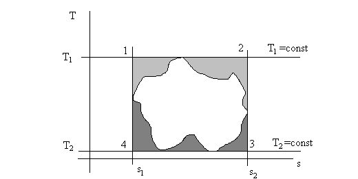 На рис. 4.5 показана диаграмма T – s , изображен цикл Карно и любой (произвольный) цикл в тех же температурных пределах Т1 и Т2. Вспомним, что