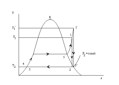 Обращаем внимание, что количество «пользы», т.е. работы за цикл увеличилось с увеличением Т1, но одновременно увеличились потери теплоты в конденсаторе, увеличились затраты теплоты за цикл. Здесь наглядно видно, что у дроби ηt увеличился и числитель и знаменатель, а результат неопределенен (см. (6.5)). Зато воочию видно, что увеличение Т1 до Т1΄ увеличивает <T1>. Следовательно, ηt увеличивается с увеличением Т1.
