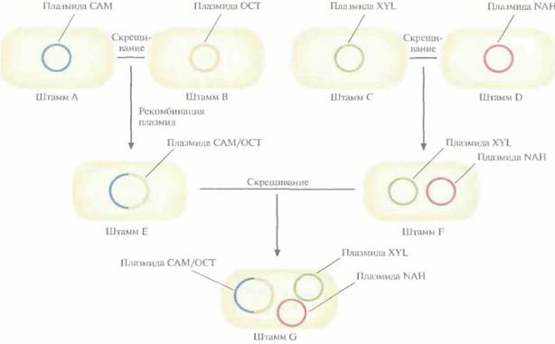 несли плазмилу САМ в штамм, несущий плазмиду ОСТ. Эти две плазмиды несовместимы (не могут существовать в одной клетке в виде отдельных плазмид), но в результате происходящей между ними рекомбинации образуется одна плазмида, объединяющая их функции. Затем аналогичным путем плазмиду NAH перенесли в штамм, несущий плазмиду XYL.Эти плазмиды совместимы и могут сосуществовать в одной клетке-хозяине. И наконец, гибридную плазмиду перенесли в штамм, несущий плазмиды NAH и XYL. В результате всех этих манипуляций получили штамм, который растет на неочищенной нефти лучше исходных штаммов, взятых по отдельности или вместе.