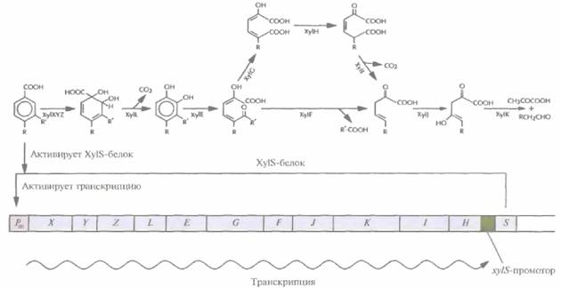иного метаболического пути. Осуществимость этого подхода проверяли на примере плазмиды pWWO, 12 генов которой кодируют мета-расщепление толуола и ксилола. Обладающие этой плазмидой псевдомонады могут использовать в качестве источника углерода алкилбензоаты (рис. 13.6). Указанные гены входят в состав одного xyl-оперона, находящегося под контролем Pm-промотора. Транскрипционная активность последнего находится под позитивным контролем продукта гена xylS, активируемого почти всеми субстратами данного метаболического пути (например, бензоатом и 3-метилбензоатом) (рис. 13.6). Детальный биохимический и генетический анализ показал, что несущие pWWO-плазмиду бактерии могут расщеплять 4-этилбензоат только до 4-этилкатехола, который инактивирует один из основных ферментов данного метаболического пути, катехол-2,3-диоксигеназу, являющуюся продуктом гена xylE, и поэтому не разрушается и накапливается в среде. Кроме того, 4-этилбензоат, в отличие от остальных алкилбензоатов, не активирует XylS-белок; поэтому, если он является единственным субстратом, xyl-оперон не транскрибируется. Для усовершенствования природной системы мета-расщепления алкилбензоатов необходимо решить две основные задачи: 1) предотвратить инактивацию катехол-2,3-диоксигеназы 4-этил-бензоатом; 2) индуцировать транскрипцию генов xyl-оперона в том случае, если единственным субстратом является 4-этилбензоат.