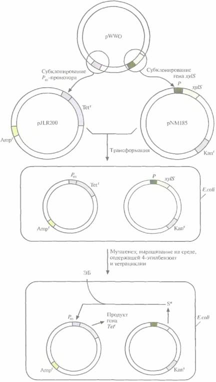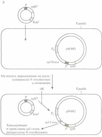Для решения второй задачи был проведен поиск мутантной плазмиды. Для этого в плазми-ду, несущую ген устойчивости к ампициллину, встроили ген устойчивости к тетрациклину, находящийся под контролем Pm-промотора. В другую плазмиду, несущую ген устойчивости к ка-намицину, встроили ген xylS. Полученными конструкциями трансформировали E. соli, отобрали клетки, содержащие обе плазмиды, по признаку устойчивости к ампициллину и канамицину (рис, 13.7, А), обработали их мутагеном этилметансульфонатом и вырастили на среде, содержащей тетрациклин и 4-этилбензоат. Растущие на этой среде клетки содержат мутантный ген xylS ипродуцируют измененный XylS-белок (S*), который способен взаимодействовать с 4-этилбензоатом и активировать транскрипцию гена устойчивости к тетрациклину. Чтобы решить проблему инактивации катехол-2,3-диоксигеназы, мутантный ген xylS встроили в плазмиду с широким кругом хозяев, несущую ген устойчивости к канамицину, и ввели ее в клетки P. putida, содержащие плазмиду pWWO (рис. 13,7, Б). Трансформированные клетки высеяли с высокой плотностью на чашки с минимальной средой, содержащей 4-этилбензоат в качестве единственного источника углерода, канамицин для отбора клеток с плазмидой и этилметансульфонат. Клетки, растущие на этой среде, вырабатывают измененную катехол-2,3-диоксигеназу, которая не ингибируется 4-этил-катехолом. Дополнительный анализ подтвер-