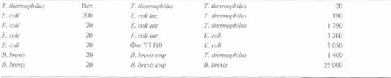 Термофильная бактерия Thermus thermophilus продуцирует ксилозо/глюкозоизомеразу, которая сохраняет свою активность и остается стабильной при 95°С, а потому представляется весьма перспективной для промышленного использования. К. сожалению, природный штамм T. ihermophilus вырабатывает ее в небольшом количестве. Чтобы устранить этот недостаток, выделили ген ксилозо/глюкозоизомеразы 71 tfter-mophilus и осуществили его экспрессию в Е, coli и В. brevls с использованием разных промоторов и разных сайтов связывания с рибосомой (табл. 13.5). В последней из представленных в табл. 13.5 систем фермент вырабатывался в количестве, более чем в 1000 раз превышающем исходное, что позволяет использовать ее для промышленного получения фруктозы.