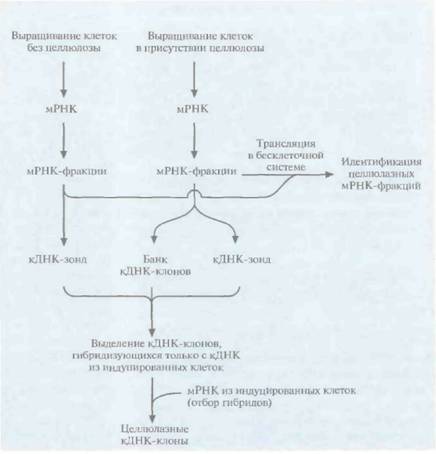 Скрининг кДНК- или геномных библиотек с помощью гибридизации с гетерологичным зондом не очень эффективен при идентификации целлюлазных генов, поскольку их нуклеотидные последовательности довольно сильно различаются у разных организмов. Поэтому нужны новые подходы для выделения мРНК целлюлолитических ферментов из грибов или растений. К сожалению, эти мРНК составляют лишь небольшую часть суммарной мРНК, поэтому приходится обогащать библиотеки этими мРНК или кДНК и элиминировать кДНК-клоны, не несущие последовательности-мишени. Для выделения некоторых генов эукариотических целлюлаз использовали метод «дифференциальной гибридизации», суть которого состоит в следующем (рис. 13. 16).