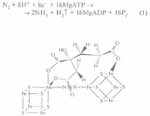 Все известные нитрогеназы содержат два кисло-родчувствительных компонента: I и 11. Компонент 1 — это комплекс из двух а-субъединиц (массой примерно 50 000 Да каждая), двух β-субъединиц (примерно 60 000 Да каждая), 24 молекул железа, двух молекул молибдена и железо-молибденового кофактора, обозначаемого FeMoCo (рис. 14.1). Компонент II состоит из двух α-субъединиц (примерно 32 000 Да каждая) и из неизвестного числа молекул железа, причем его α-субьединицы не аналогичны таковым в компоненте 1. Для фиксации азота необходимы оба компонента, комплекс магния и ATP, a также источник восстановительных эквивалентов: