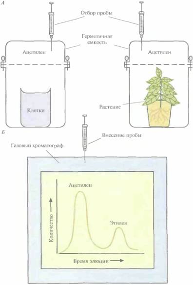 | Рис. 14.2. Определение активности нитрогеназы по восстановлению ацетилена до этилена. А, Бактерии (в культуре или ассоциированные с корнями растения), синтезирующие нитрогеназу, либо препарат очищенного фермента (не показано) помещают в герметичную емкость в атмосферу ацетилена. Б. Из емкости периодически отбирают пробы и методом газовой хроматографии измеряют количество ацетилена и этилена. Активность нитрогеназы пропорциональна количеству образовавшегося этилена. |