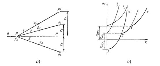 Пусть основной трубопровод имеет разветвление в сечении М-М, от которого отходят, например, три трубы 1, 2 и 3 разных диаметров, содержащие различные местные сопротивления (рисунок 4.5, а). Геометрические высоты