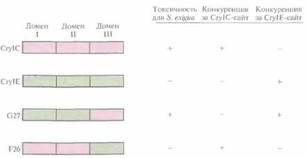 Белки CrylC и CrylE токсичны для чешуекрылых, но обладают разной видоспецифичностью: CrylC действует на S. exigua, Mamestra brassicae и Manduco sexta, в то время как CrylE — только на M. sexto. В одной из лабораторий был создан гибридный белок CrylC-CrylE, токсичность которого проверялась на разных насекомых. Была исследована также его способность связываться с различными рецепторами (рис. 15.5). Гибридный токсин G27, содержащий домен IIIбелка CrylC, был токсичен для личинок S. exigua, хотя связывался только с Сгу1Е-рецептором, но не с рецептором CrylC, И наоборот, гибридный токсин F26 не оказывал действия на личинок S. exigua, хотя и связывался с CrylC-рецептором. Поскольку токсичные для S. exigua белки CrylC и G 27 связываются с разными рецепторами на поверхности клеток кишечника насекомого, одновременная или поочередная обработка S. exigua двумя этими токсинами может уменьшить вероятность появления устойчивого к ним штамма, поскольку для этого необходимо, чтобы мутационные изменения произошли одновременно в двух разных белках.