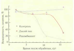 | Рис. 15.7. Выживаемость личинок T. ni после обработки листьев капусты бакуловирусом дикого типа или рекомбинантным бакуловирусом, экспрессирующим ген нейротоксина скорпиона. На контрольные растения наносили только личинок насекомых. Чем ниже выживаемость, тем больше личинок погибло и тем больше эффективность обработки. Растения обрабатывали бакуловирусами только один раз в начале эксперимента. |