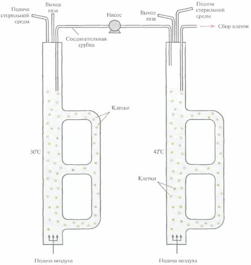 них подается в нижнюю часть вертикального канала. Поднимаясь, он увлекает за собой жидкость к верхней части канала — газожидкостному сепаратору, и здесь частично выходит в воздух. Более плотная деаэрированная жидкость опускается по другому вертикальному каналу ко дну реактора, и процесс повторяется. Таким образом, культуральная среда вместе с клетками непрерывно циркулирует в биореакторе.