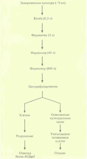 | Рис. 16.6. Схематическое представление промышленного синтеза белка AGßgai. В скобках указан объем культуральной среды на каждом этапе. На ее долю приходится от 60 до 75% объема соответствующих биореакторов (ферментеров). |