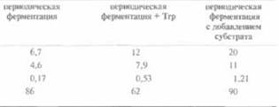 | 1) Поданным работы Cosset et al,, AppL MikrobioL Biotechnol. 39; 541-546, 1993. 2) Количество биомассы измеряется в граммах сухого вещества на литр культуры. Процедура «Периодическая ферментация + Тrр» означает, что к культуре добавлено 0,1 г триптофана. При периодической ферментации с добавлением субстрата в среду добавляли 0,1 г триптофана каждые 2 ч — в обшей сложности пять раз в течение 10 ч. При добавлении большего количества триптофана не увеличивались ни биомасса, ни количество синтезированного белка. |
