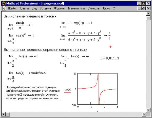 На Рисунке 12 показаны примеры вычисления пределов. При вычислении пределов нужно заполнить шаблоны, входящие в главный шаблон для вычисления пределов, а затем ввести функцию, имя переменной, по которой ищется предел, и значение переменной — аргумента функции.