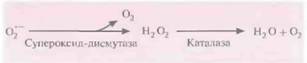 | Рис. 18.12. Превращение супероксид-аниона в пероксид водорода, а затем в воду и кислород. |