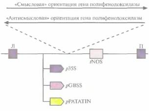 | Рис. 18.18. Конструкции со «смысловой» и «антисмысловой" ориентациями гена полифенолоксидазы. Транскрипция в обоих случаях осуществлялась под контролем одного из промоторов: 35S-промотора вируса мозаики цветной капусты (p35S), промотора гена синтазы гранулосвязанного крахмала (рС BSS) или промотора гена пататина 1 (pPATATIN), а также сигнала терминации транскрипиии гена нопалинсинтазы (tNOS). Л и Π — левая и правая фланкирующие последовательности Т-ДНК соответственно. (По данным работы Bachern et al., Bio/Technology 12: 1101-1105, 1994.) |