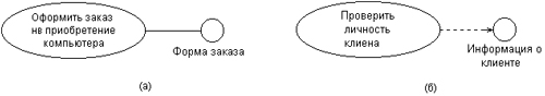 Графический символ отдельного интерфейса может соединяться на диаграмме сплошной линией с тем вариантом использования, который его поддерживает. Сплошная линия в этом случае указывает на тот факт, что связанный с интерфейсом вариант использования должен реализовывать все операции, необходимые для данного интерфейса, а возможно и больше (рис. 14, а). Кроме этого, интерфейсы могут соединяться с вариантами использования пунктирной линией со стрелкой (рис. 14, б), означающей, что вариант использования предназначен для спецификации только того сервиса, который необходим для реализации данного интерфейса.
