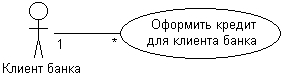 В качестве примера этой записи можно привести кратность отношения ассоциации для варианта использования "Оформить кредит для клиента банка" (рис. 16). Здесь кратность "*" означает, что каждый отдельный клиент банка может оформить для себя несколько кредитов, при этом их общее число заранее неизвестно и ничем не ограничивается. При этом некоторые клиенты могут совсем не иметь оформленных на свое имя кредитов (вариант значения 0).
