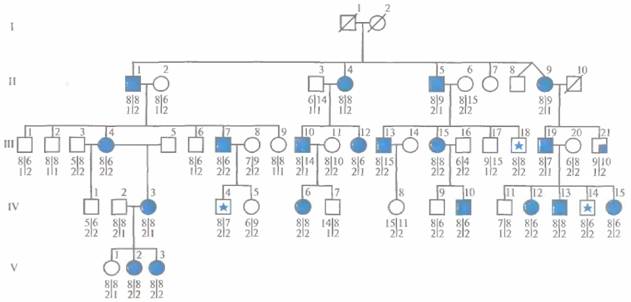 | Рис. 20.16. Анализ гаплотипов двух хромосом по 20 полиморфным локусам в родословной, члены которой больны BFNC. Числа под символами - аллели двух полиморфных локусов, D20S19 и D20S20 (верхние и нижние числа соответственно). Гаплотипы двух хромосом индивидуума разделены вертикальной чертой. Перечеркнутые символы соответствуют умершим индивидам, цветные — липам, страдающим данным заболеванием. Символ с закрашенной четвертью квадрата отвечает случаю, когда «клинический» фенотип индивида отличался от фенотипов других больных членов семьи. II-8 и II-9 - неидентичные (разнояйцевые) близнецы. Символами со звездочкой отмечены случаи возможного проявления неполной пенетрантности (III-18, IV-4, IV- 14). У больных членов семьи обнаруживается косегрегация гаплотипа (8,2) с заболеванием, все они несут эту хромосому, унаследованную от общего предка. (По данным работы Leppert et al., Nature [London] 337: 647-64S, 1989.) |