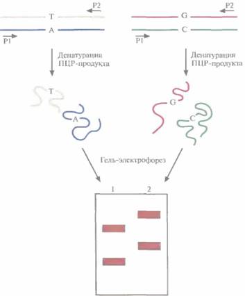| Рис. 20.22. Анализ конформационного полиморфизма одноцепочечной ДНК (SSCP). Препараты ДНК, различающихся одной парой нуклеотидов (А:Т<--> G:C), амплифицируют ПЦР-методом с использованием одинаковых праймеров (PI , Ρ2). ПЦР-продукты денатурируют и разделяют с помощью гель-электрофореза на двух дорожках (1,2). Расстояние, на которое перемешается одноцепочечная молекула ДНК, зависит от ее конформации, а последняя, в свою очередь, — от нуклеотидной последовательности. Даже если ДНК различаются лишь одним нуклеотидным сайтом, одиночные цепи могут иметь разную конформацию, а следовательно, ПЦР-продукты образуют в геле не две, а четыре полосы. |