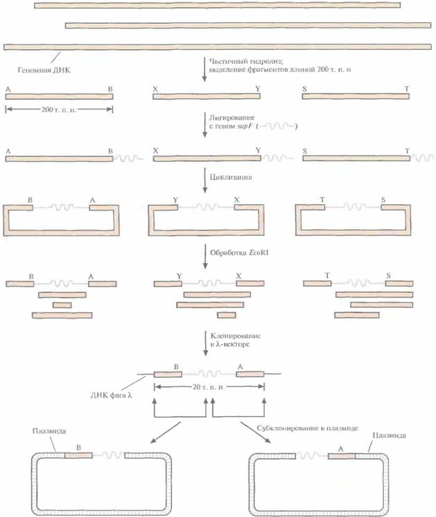 | Рис. 20.26. Создание библиотеки методом «прыжков по хромосоме». Проводят частичный гидролиз геномной ДНК рестриктазой, делающей небольшое число разрывов, и выделяют фрагменты длиной примерно 200 т. п. н. Сшивают их с геном supF (~7т. п.н.) и замыкают в кольцо. Буквами А и В, X и Y, S и Т обозначены сайты, исходно находящиеся друг от друга на расстоянии 200 т. п. н., но после циклизации фрагментов разделенные 7 т, п. н. Кольцевые молекулы, содержащие множество сайтов для EcoRI, обрабатывают этой рестриктазой, в результате чего среди прочих образуются фрагменты, содержащие ген supF и фланкирующие его последовательности (А и В; X и Y; S и Т). Из всех фрагментов отбирают лишь те, длина которых составляет примерно 20 т. п. н., и встраивают их в вектор на основе фага λ. Векторы, несущие ген supF, будут амплифииироваться в SupF~ -клетках-хозяевах. Идентифицируют клон, гибридизующийся с зондом, специфичным в отношении исходной последовательности (А, X, S), затем субклонируют его; при этом та его часть, которая не гибридизуется с зондом, содержит участок ДНК (В, Y, Т), находящийся на расстоянии 200 т, п. н. от исходной последовательности. |
