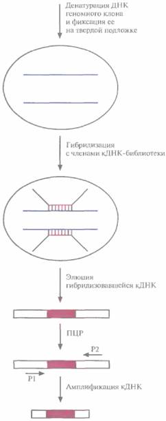 | Рис. 20.28. Отбор гибридов. Гибридизацией с ДНК геномного клона «отлавливают» кДНК-клон, амплифицируют его, клонируют и тестируют. |
