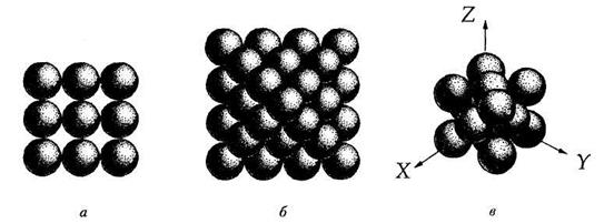| Рис. 7.5. Плотнейшая шаровая укладка из квадратных слоев: а — изолированный квадратный шаровой слой (соотношение числа шаров и лунок — 1:1); б — квадратные слои образуют плотнейшую упаковку; в — шары плотнейшей упаковки служат узлами кубической гранецентрированной (F) решетки Браве |