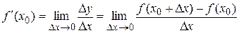 Определение 2.1Пусть функция y = f(x) определена в некоторой окрестности точки х0. Предел отношения приращения Dу функции в этой точке (если он существует) к приращению Dх аргумента, когда Dх ® 0, называется производной функции f(x) в точке х0.