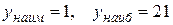 Обе эти точки принадлежат интервалу (-2;3). Вычислим значения функции в критических точках и на концах отрезках: у(-1) = 5, у(1) = 1, у(-2) = 1, у(3) = 21. Сравнивая полученные числа, получаем наименьшее значение в точках х1= 1 и х2 = -2, а наибольшее значение – в точке х3 = 3. Значит