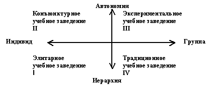 На мезоуровне инновации направлены на изменения в образовательной среде региона, в конкретных учебных заведениях. В основном речь идет о создании новых учебных заведений на базе новых концептуальных подходов. Сегодня в России можно выделить 4 типа учебных заведений как средних, так и высших: элитарные учебные заведения, конъюнктурные учебные заведения, экспериментальные и традиционные учебные заведения [5].
